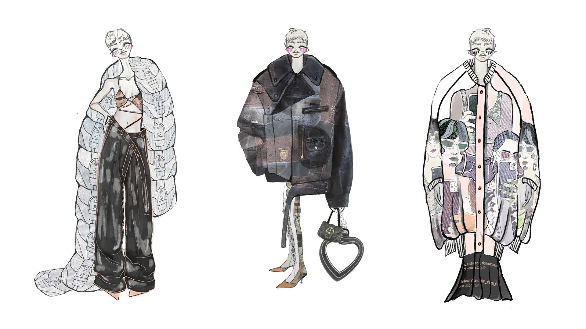Aya’s Redress Design Award collection, ‘Re-verie’, draws inspiration from the raw energy of the streets and the lost fabrics waiting to be rediscovered, combined with early 2000s glamour, kitsch, and culture. Designing for low impact, she reconstructs defective and unusable leather garments into new looks using a patchwork technique. A bodysuit is made from deadstock polka dot lace fabric end-of-roll sourced from an atelier. Aya also creates looks from high-quality upholstery fabrics sourced from discarded commercial fabric samples, designing for longevity via durable materials.