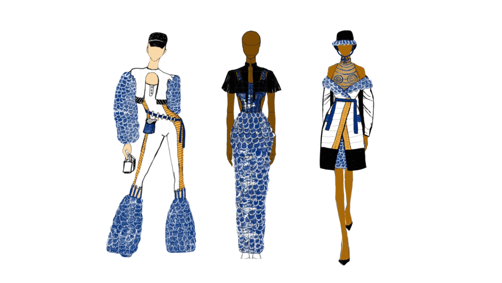 Nicoya’s Redress Design Award collection ‘Fusion’ is inspired by the designer’s work environment and her country’s traditional carnival cultural icon, the Jam Bull. She uses textile waste from previous projects, local sail shops, and discarded denim jeans to create multipurpose, versatile garments that evoke the sounds, rhythms, and fluidity of waters and cultural dances. Designing for longevity, Nicoya prioritises comfort to encourage more use from the wearer.