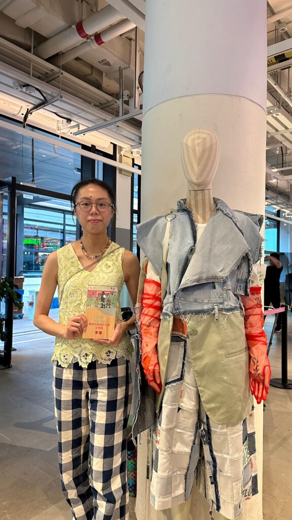 earl’s Redress Design Award collection, ‘The Story Behind’, draws inspiration from the environment of the designer’s upbringing. The collection incorporates local vintage items and elements of old Hong Kong culture, such as ornate iron gates and chequered bread packaging, to encourage longevity through emotional connection. Vintage flour bags are upcycled with zero waste and hand-pleated into a long wrap skirt in one look, while in another, a jacket lined with green mesh is reminiscent of rain, and a tube slit dress evokes the colours of the iconic fish dish, golden threadfin bream or the red-shirt fish (紅衫魚).