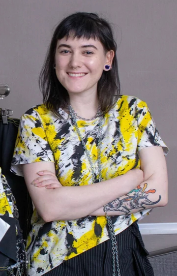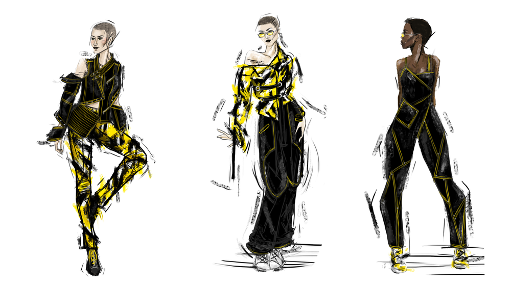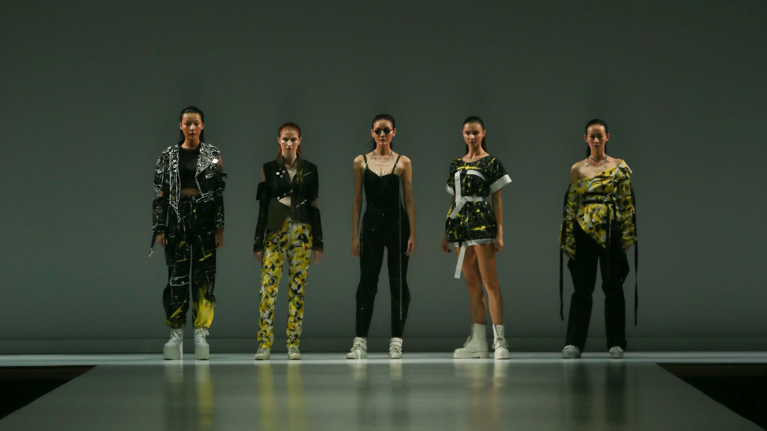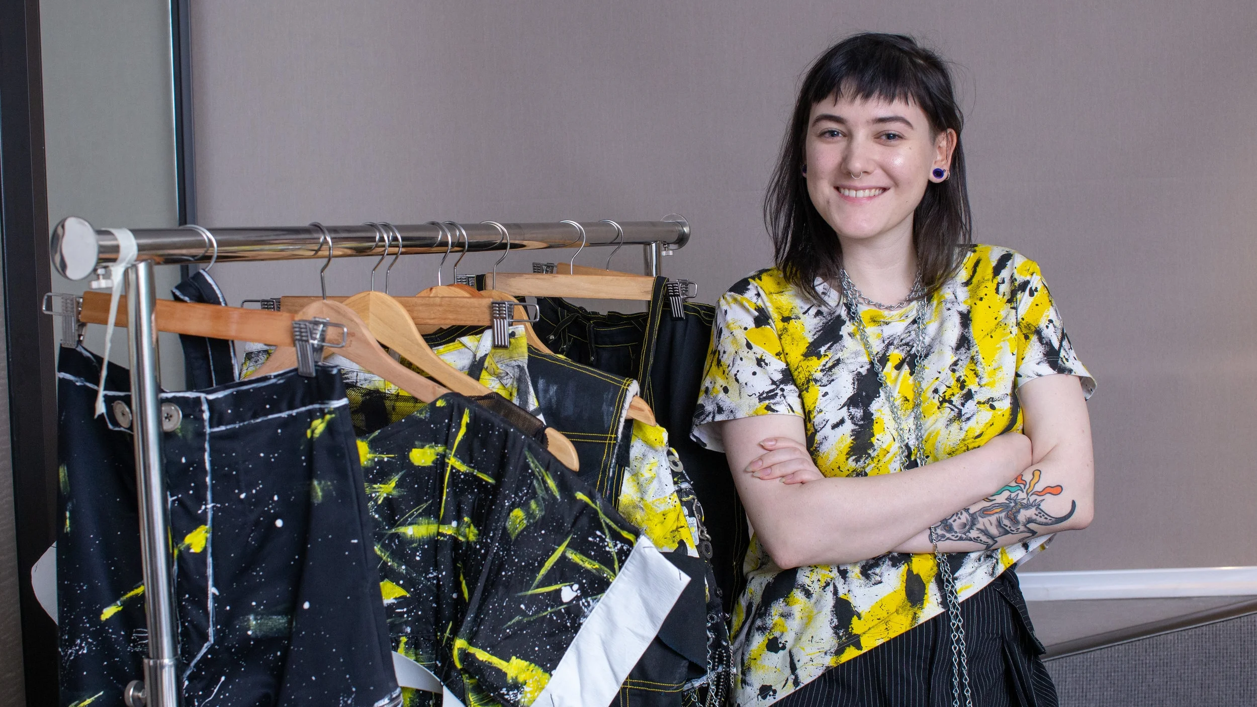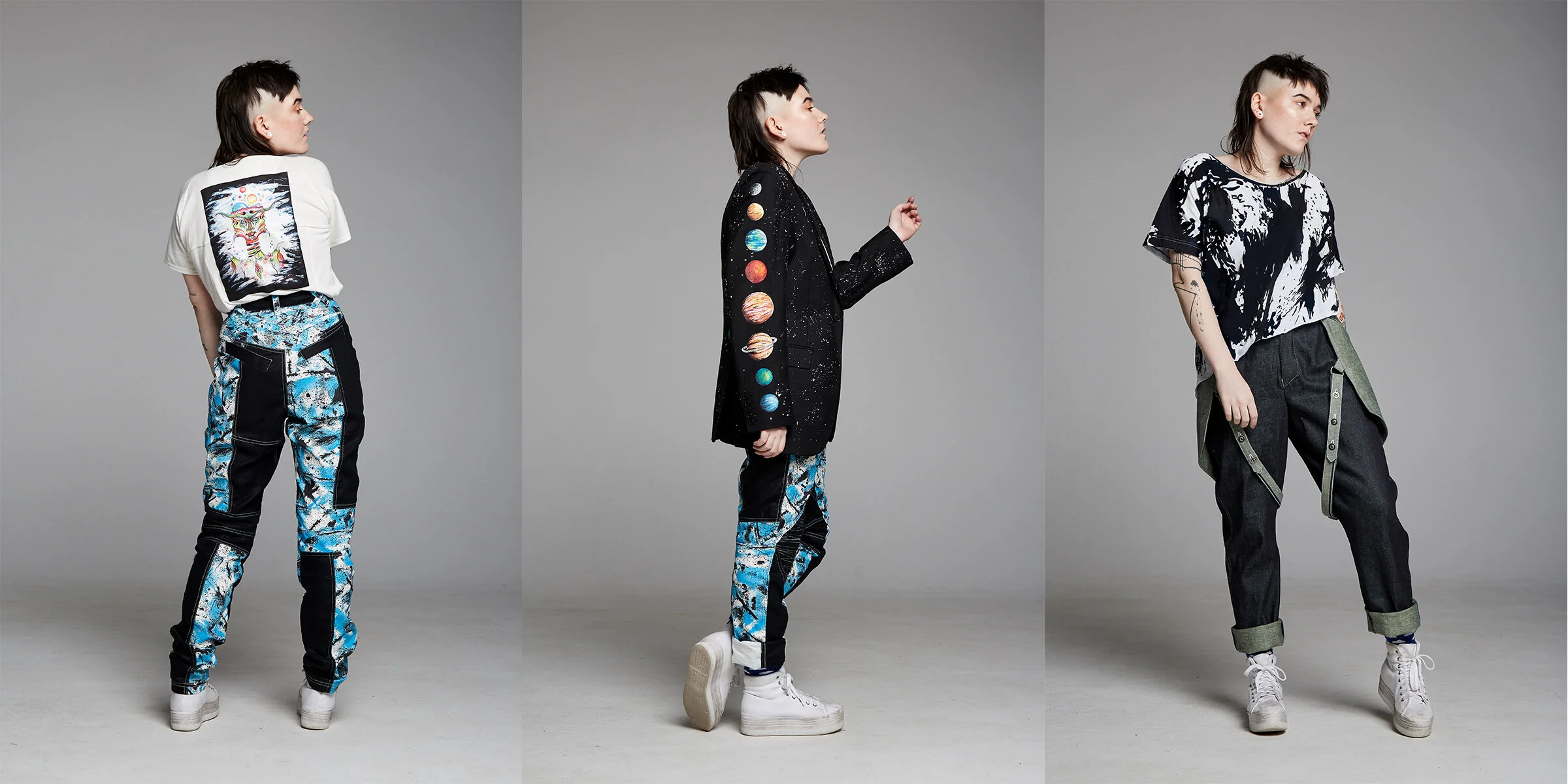 For their Redress Design Award submission, Tylar was inspired by different subcultures and the way people express themselves through their clothing choices. They applied the design techniques of upcycling and zero-waste to industry end-of-rolls, customising their edgy, androgynous collection through the use of eco-friendly inks and paints.